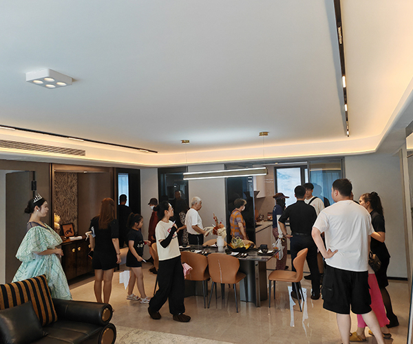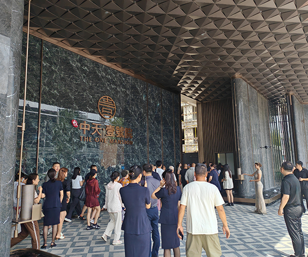 儀式現場,熱情高漲的客戶早已匯聚于這座流光溢彩的東大門前。以名貴理石精工筑就、星空頂熠熠生輝、水幕墻靈動瀉玉、噴泉水系恭迎貴賓的“星幕尊邸門”,其本身即是歸家尊崇儀式的開篇序章,成為令人矚目的視覺地標。人群中,既有開盤即購房的業主,滿懷憧憬前來借鑒設計靈感,為未來愛家描繪藍圖;亦有眾多意向濃厚的準業主,翹首以盼親身體驗升級品質,為理想生活尋覓最契合的空間載體。