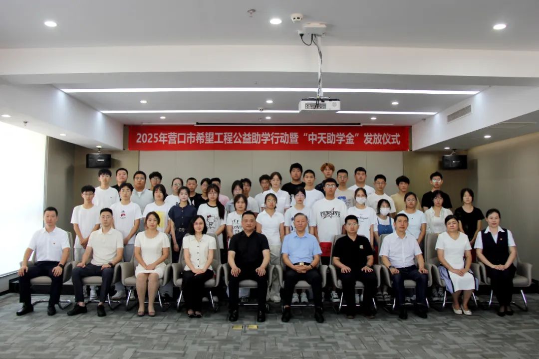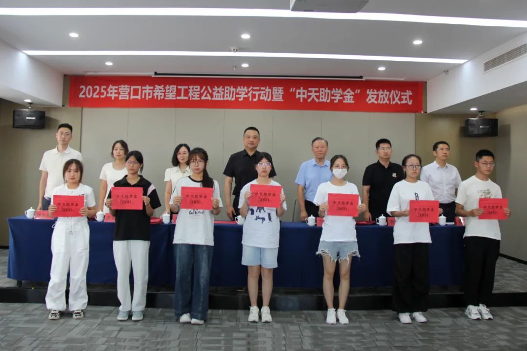 8月18日下午,2025年營口市希望工程公益助學行動暨“中天助學金”發放儀式在中天集團總部會議室舉行。營口市團市委書記劉慶男,中天企業集團董事長于寶權、總裁于洪波,營口市團市委副書記李瀚霖、曹午陽,營口市教育局副局長關雪嬌,營口市慈善總會副會長黃渤以及獲得資助的35名學生,出席了本次發放儀式。