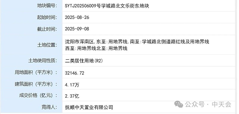 2025年9月8日,遼寧中天企業(yè)集團(tuán)旗下?lián)犴樦刑熘脴I(yè)有限公司以2.37億成功斬獲備受矚目的沈陽市渾南區(qū)核心板塊長青學(xué)城路北、文樂街東地塊,標(biāo)志著中天集團(tuán)成功進(jìn)軍沈陽市,進(jìn)一步實現(xiàn)布局遼寧的戰(zhàn)略構(gòu)想,企業(yè)戰(zhàn)略發(fā)展版圖再擴(kuò)張。